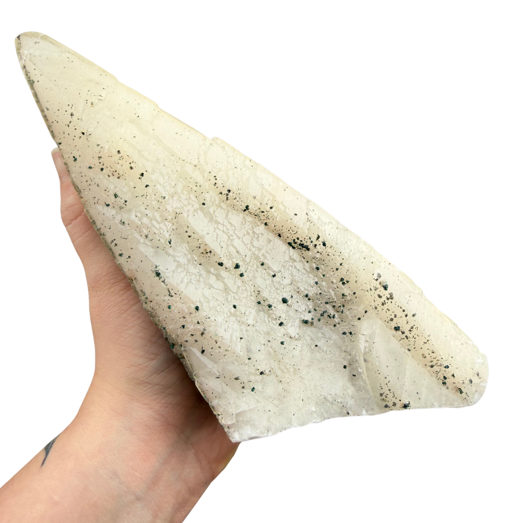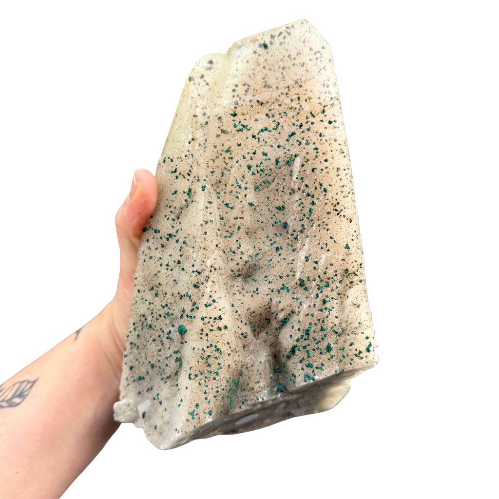 This is a new find from China. Dogtooth calcite formations with pyrite inclusions and malachite on the outside.