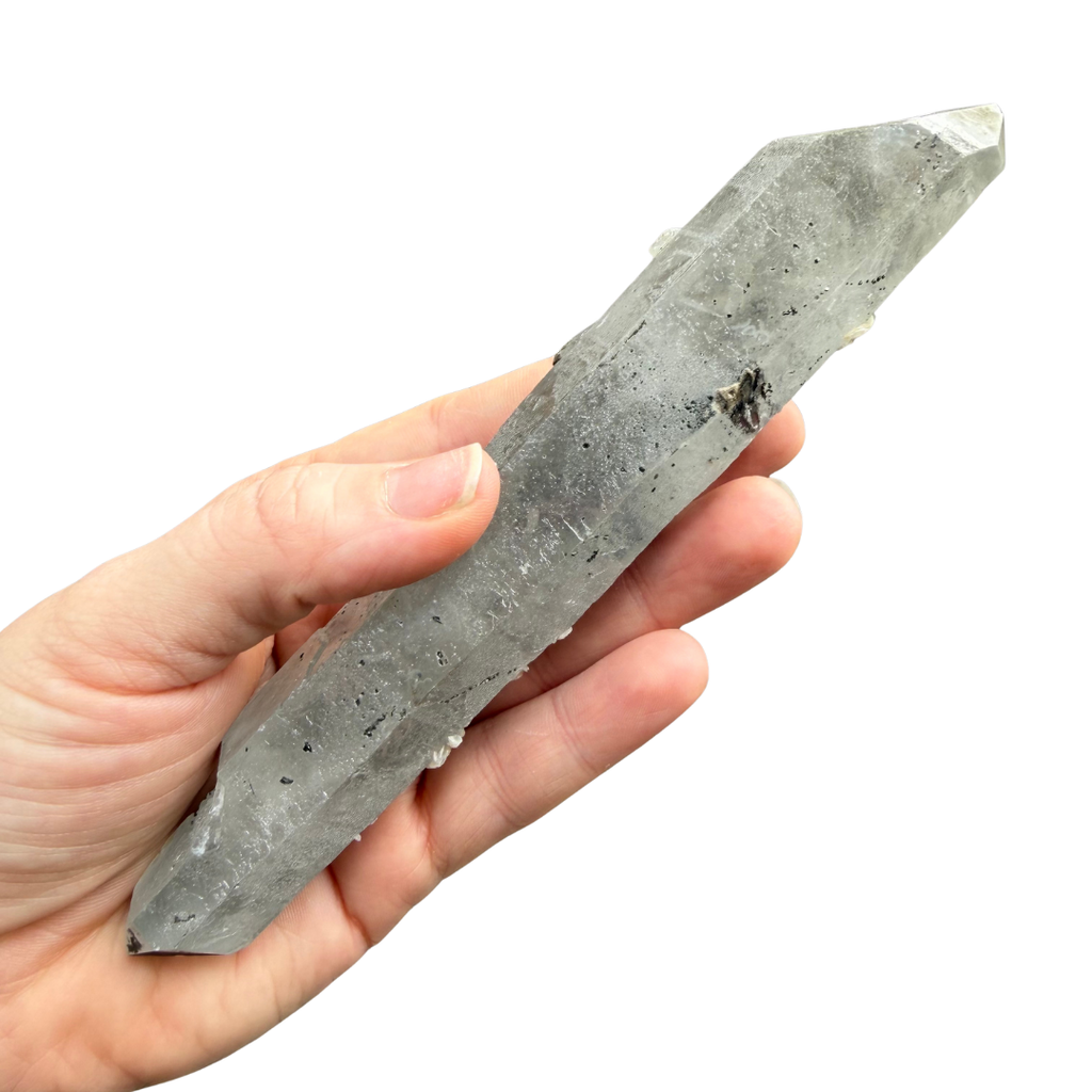 This listing is for one (1) quartz point with specularite (black hematite) and calcite (the white mineral and this UV reacts bright pink) specimen.